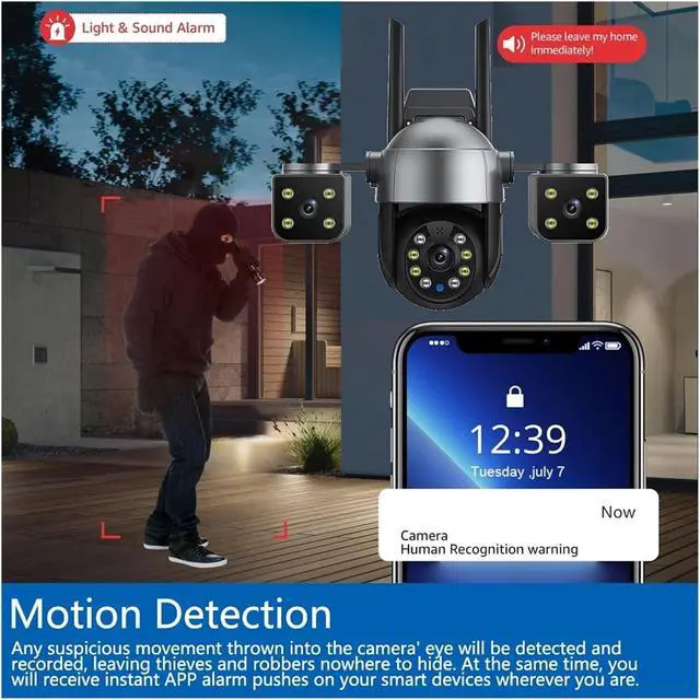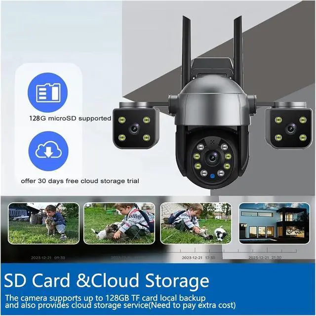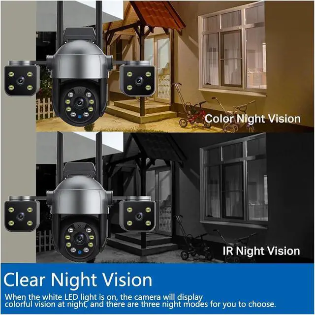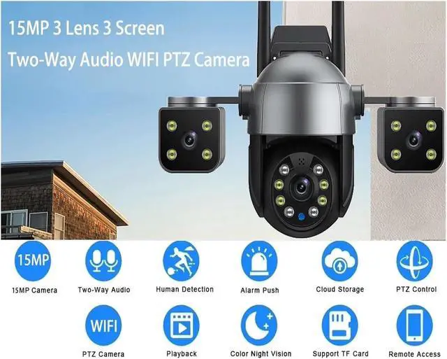 15MP ultra-high definition + full-color night vision: 15MP (5MP×3) high-definition resolution, supporting infrared night vision and dual-light alarm mode. Infrared imaging is performed when there is no moving object, and when movement is detected, the white light is automatically turned on to switch to full-color mode, ensuring clear details for day and night monitoring.