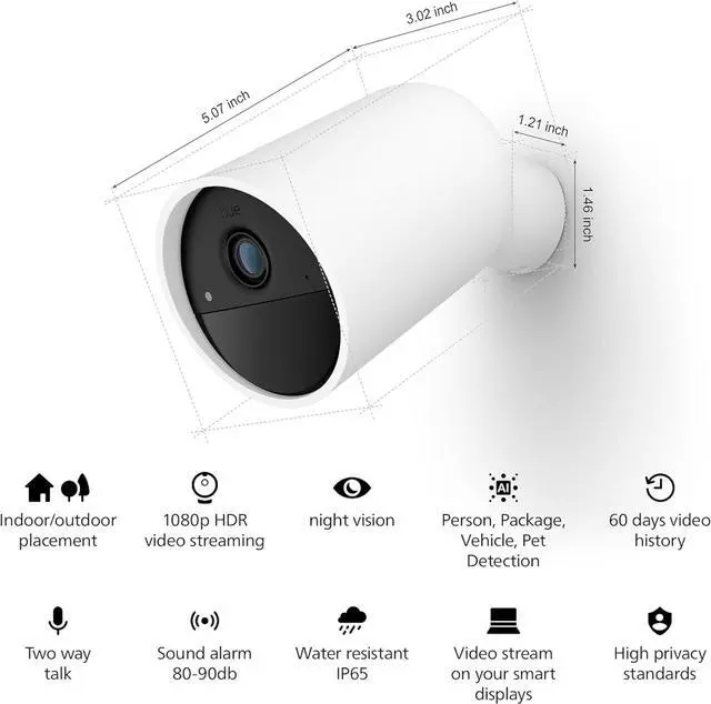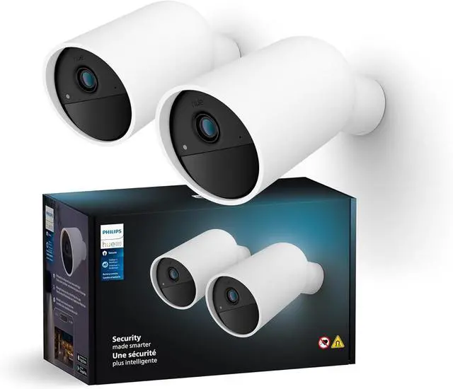 Customer Reviews 3.3 out of 5 stars293.2 out of 5 stars213.6 out of 5 stars173.6 out of 5 stars4 Price$159.99$159.99$129.99$129.99$144.99$144.99$309.99$309.99 ColorBlack / WhiteBlack / WhiteBlack / WhiteBlackPlacement CameraBackyard, FrontyardBackyard, FrontyardCabinet, Desk, FreestandingBack garden, Front gardenWeatherproofYes, IP65Yes, IP65Yes, IP65Camera: IP65 & floodlight IP44PowerBattery poweredPlugs in to outletPlugs in to outletPlugs in to outletSubscription availableFree plan availableFree plan availableFree plan availableFree plan availableIntegration with lightPhilips Hue only on Hue BridgePhilips Hue only on Hue BridgePhilips Hue only on Hue BridgePhilips Hue only on Hue BridgeWhats in the boxCamera, cable, wall mountCamera, cable, wall mountCamera, cable, standCamera, cable, wall mount Battery camera white*2, 1M USB A Cable white*2, Camera Mount white*2, PSU white*2, Screws and Anchors *2 sets 3.3 out of 5 starsPhilips Hue Secure Battery-Powered Smart Home Security Camera, White - 2 Pack - 1080P HD Video - Night Vision - Motion Detection - Two-Way Talk - Indoor/Outdoor - Weatherproof - Works with Hue App