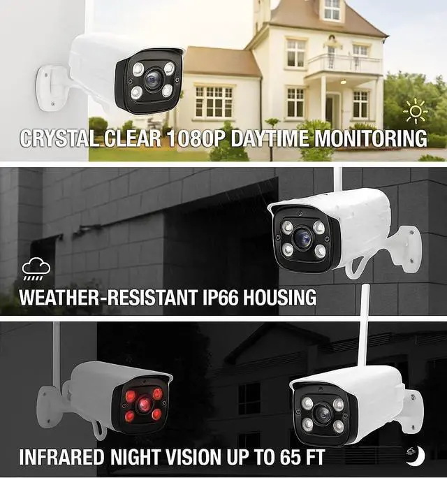 & : Rest easy knowing your property is monitored 24/7 with powerful night vision and an IP66 waterproof rating, making it ideal for outdoor and indoor use. It's built to withstand harsh weather conditions and high-pressure water jets.