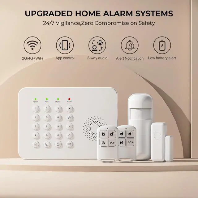 Tamper-proof Alarm & Multiple Control Methods:The Home Security System adopts a self-protection program. When external force is applied for forced removal, it will continuously emit a high-decibel alarm and simultaneously send an alarm notification to your mobile phone. You can also control and adjust it through your mobile phone, remote control, or main unit.