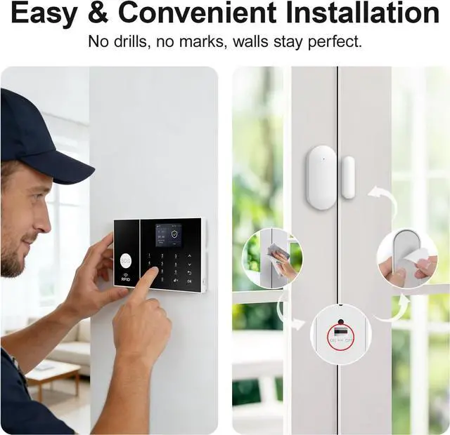 Easy Installation & Comprehensive Functions:Alarm system is simple to install without professional help. Door magnetic sensors or motion detectors are quick and sensitive, immediately triggering the main unit to emit over 110dB alarm when activated, while automatically sending APP notifications, phone calls, and SMS alerts.