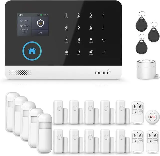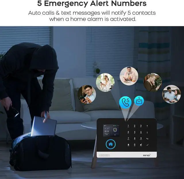 Additional Features: The home security system also includes tamper alarm, delayed arming/disarming, auto-dial & SMS notifications (up to 5 numbers), two-way voice call, and scheduled arming/disarming.No extra charges for the above functions
