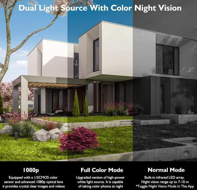 2K 3MP:The high-performance 1/2.9" CMOS sensor, resolution of 2K 3MP, together with a wide-angle lens,provides fine imaging and captures every detail for you.Full Color Mode:Upgraded high power white-light source. Its able to take color pictures at night.Normal Mode:Built in with IR LED array.Night vision range is up to 7-10 m.Switch night vision mode in the app.