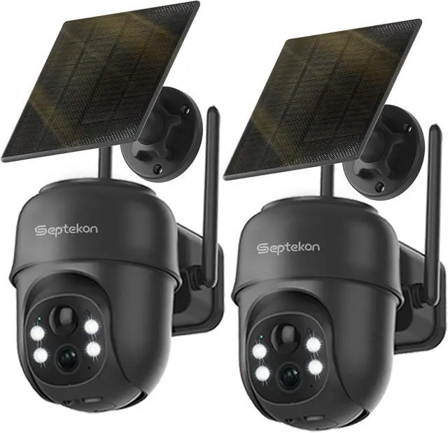 Gadpiparty Septekon 2K Solar Security Cameras Wireless Outdoor 2 Pack, 360°PTZ Battery Powered Outdoor Camera, 2.4G WiFi Camera with Spotlight Color Night Vision, Motion Sensor Alarm, IP66, Black