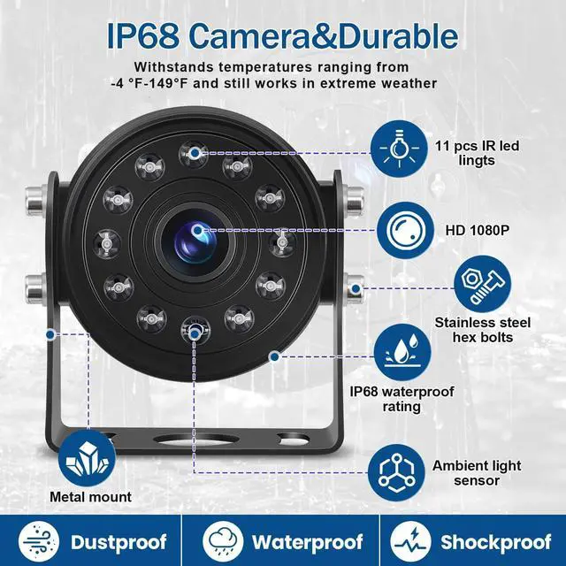 HD 1080P Rear View CameraRemember the CCD camera that was commonly used before? Its overall image quality is blurred, and it is not even an exaggeration to describe it as mosaic image quality, it simply cannot bring us the good experience that a back up camera with monitor for rv should have. Because we can't stand the low image quality, we brought this truck rear view& front view camera of resolution up to 1080P with a HD chip , whether it is day or night, it can present a clear picture.