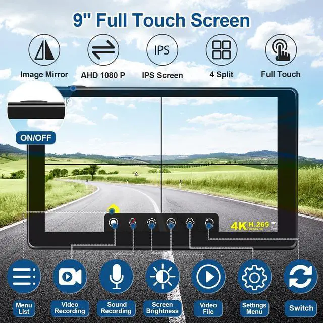 9 " HD IPS Full Touch MonitorThe screen of the trailer backup camera adopts an IPS panel that maximizes the color of the image, ensuring that you can see clear image quality from all angles. Compared with the traditional LCD screen, our IPS large screen has both brightness and color presentation. The wired backup camera for truck has been substantially improved.