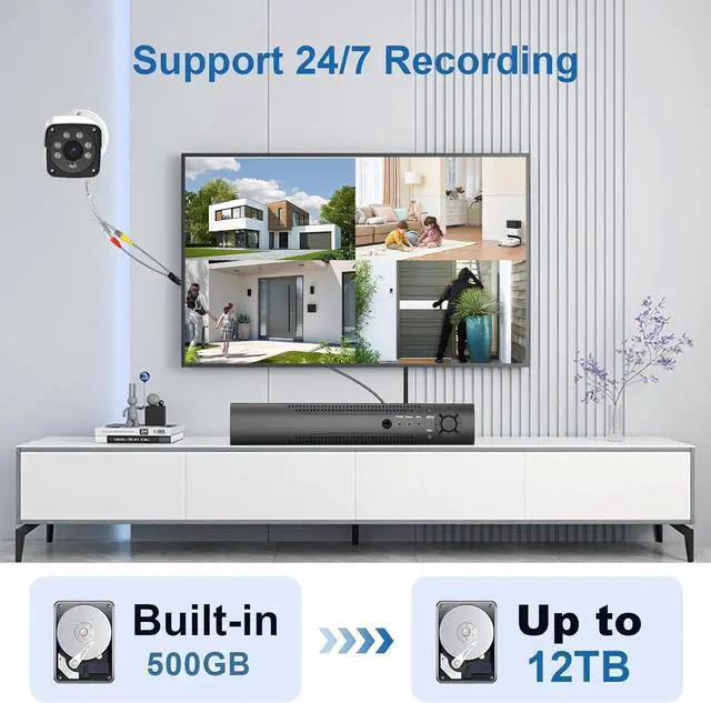 Reliable 24/7 Monitoring: Equipped with a 500GB hard drive (expandable to 12TB) and H.265+ compression, the system supports continuous recording and optimized storage, giving you 24/7 peace of mind without worrying about missing the footage. Supports VGA and HDMI high-definition output display without additional cost