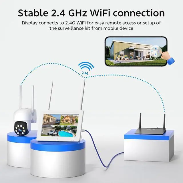 No Monthly Fee: All recordings will be encrypted and stored on 32GB Micro SD Card, so even if the wired cameras are damaged or lost, the data remains safe. No subscription or hidden cost for all recordings. Equipped with two antennas, provides stable and robust communication even at farther distances.Note: 2.4GHz WiFi ONLY