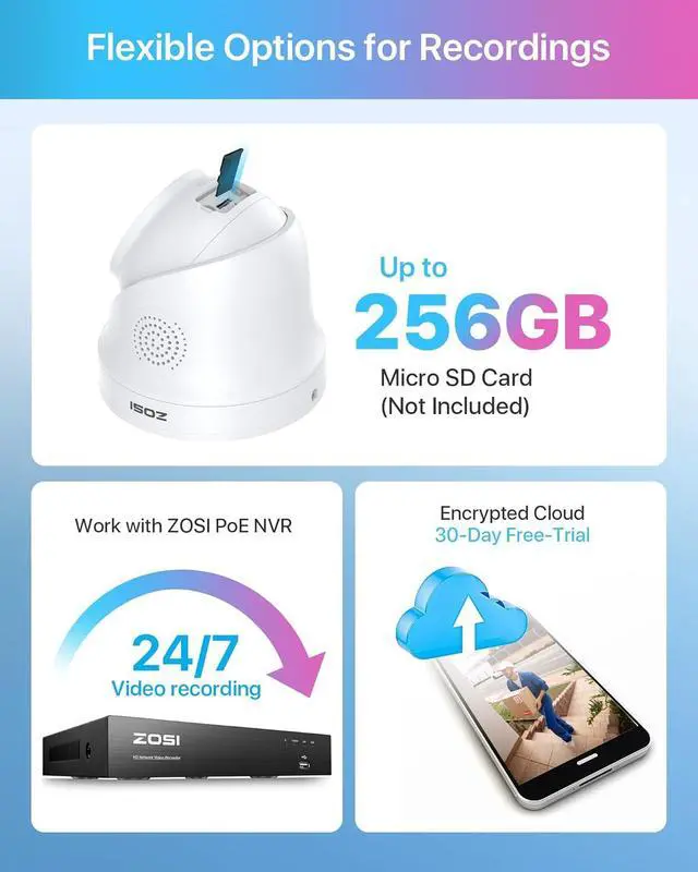 Remote Access & Flexible RecordingYou can remote access on your smartphone anytime anywhere. Only suport ZOSI Smart App/PC to remote access, NOT support any third-party App/PC, NOT support ONVIF protocol. And this PoE camera supports recording, videos can be saved in the micro SD card or ZOSI NVR with hard drive (SD card, NVR, hard drive are NOT Included) .