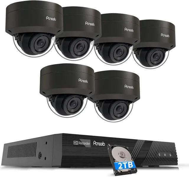Overview: This poe camera system includes 8 channel 4K PoE NVR and 6pcs 8MP IP PoE cameras. The PoE NVR is pre-installed with a 2TB hard drive. The camera lens is 2.8mm with 110-degree wide-angle, sturdy metal casing camera is protected against water and dust with IP67 ranking, making it suitable for indoor or outdoor environments. The camera with a built-in microphone one-way talk.