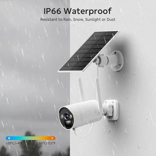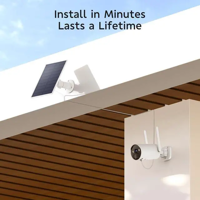 Solar-Powered, 100% Wire-free Surveillance: Powerful solar panel continuously powers the outdoor wireless camera, say goodbye to battery replacements hassles.Install it wherever sunlight exposure is optimal, thanks to its 360° rotatable bracket and 3m long solar panel cables. The camera's built-in rechargeable battery ensure continuous operation, even on cloudy days
