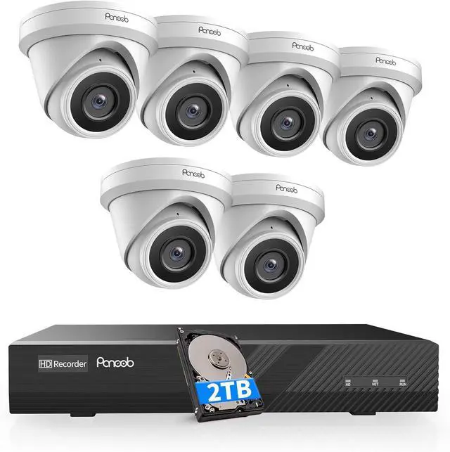 Overview: This poe camera system includes 8 channel 4K PoE NVR and 6pcs 8MP IP PoE cameras. The PoE NVR is pre-installed with a 2TB hard drive. The camera lens is 2.8mm with 110-degree wide-angle, sturdy metal casing camera is protected against water and dust with IP67 ranking, making it suitable for indoor or outdoor environments. The camera with a built-in microphone for one-way talk.