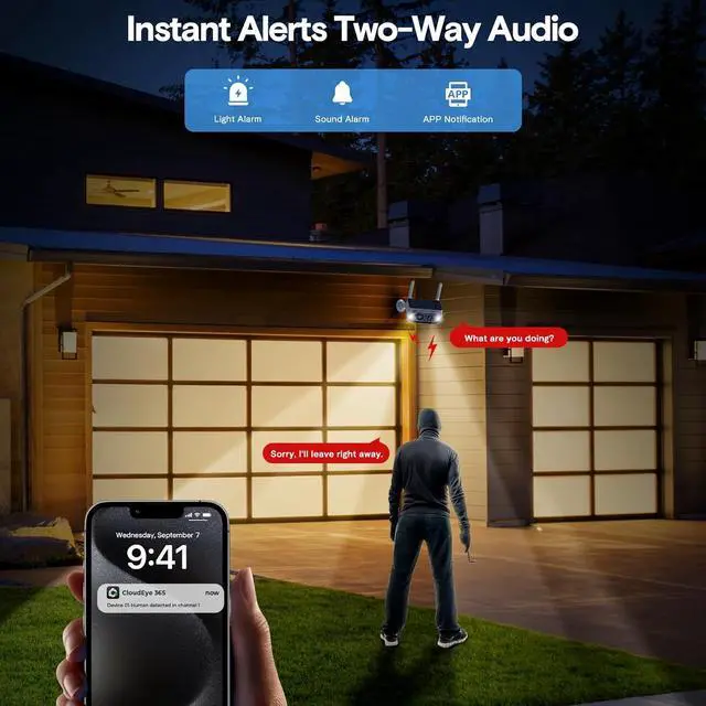 When an outdoor wireless surveillance camera detects an intruder, it will immediately sound an alarm and illuminate it, leaving the intruder nowhere to hide. It will also push real-time messages to you so that you can understand the situation immediately.