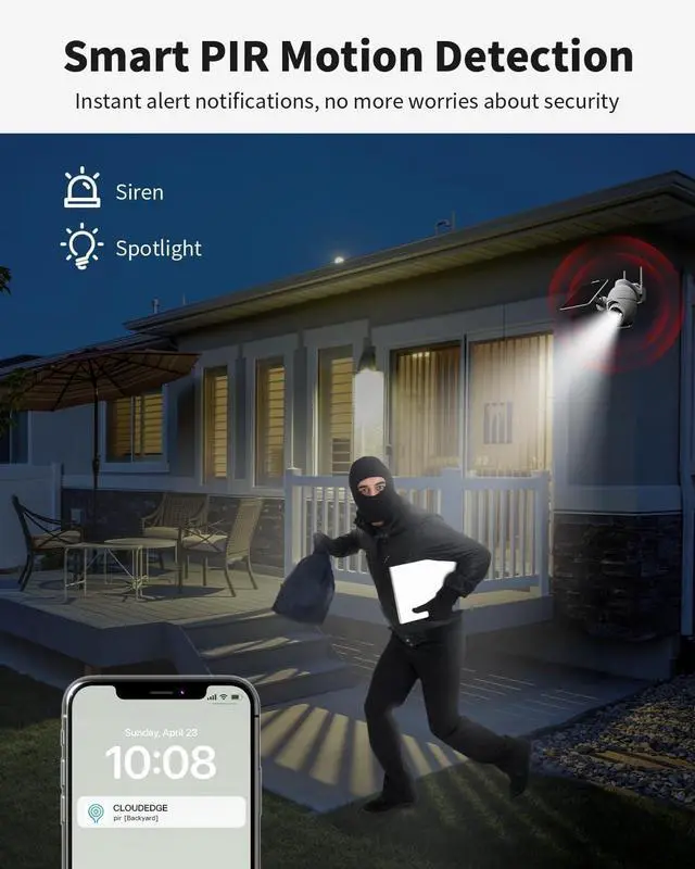 PIR Motion Detection & Customizable Motion Area: Customize motion areas and set sound/light alarms via the app. Receive notifications and activate the spotlight and alarm sound to deter intruders. Optional paid AI features include pet, vehicle, and package detection.