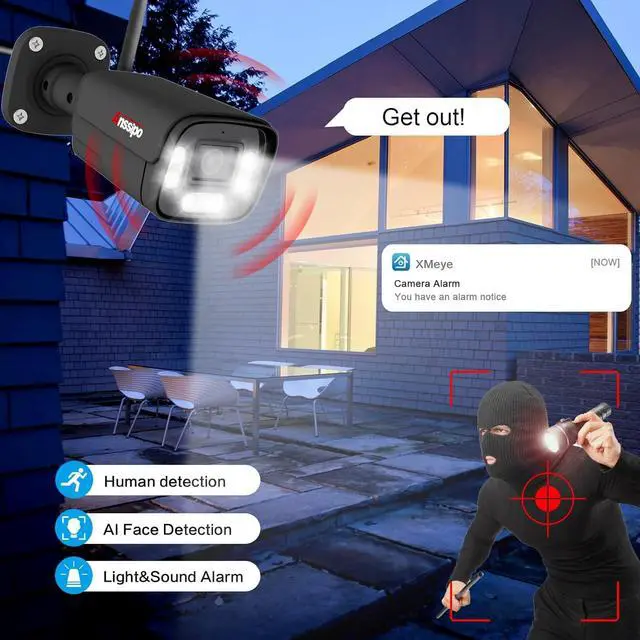 Camera Resolution: 5MP HDNVR Resolution: 5MP HDCamera Lens: 3.6mm LensCamera Function: Two way audio, Cameras builts in micphone and speakerDetection: AI Face Detection, PIR & Motion DetectionNight Vision: Color night vision & InfraredNotification: Spotlight Alert & Human motion alarm via App notificationHow to Record: Hard drive(2TB hard drive included, Max. 6TB, pls buy separately) or Cloud storage on APP (need pay for)How to Power Camera System: All cameras and NVR works with DC12V 1A(2A) power supply (NOT BATTERY POWER, NOT 100% WIRELESS)