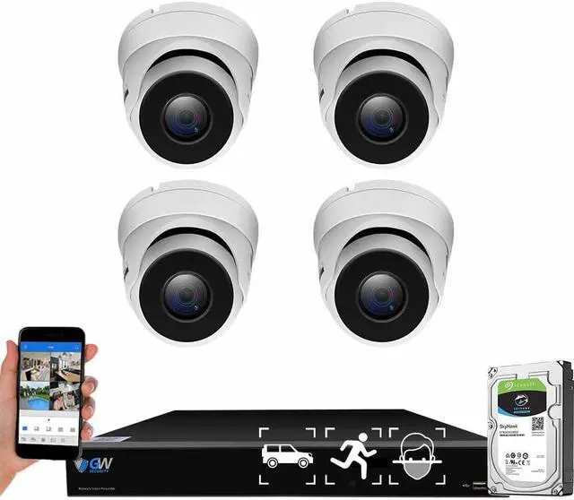Our GW 4K security cameras featured in these IP systems use advanced 8-Megapixel Sony image sensors and have approximately four times the amount of pixels as a 1080p HD security camera. This UltraHD 4K Sony image sensor allows the camera to capture more light, which improves color, contrast, and low-light performance. It also adds an increased ability to digital zoom in on distant objects without drastically reducing image quality.