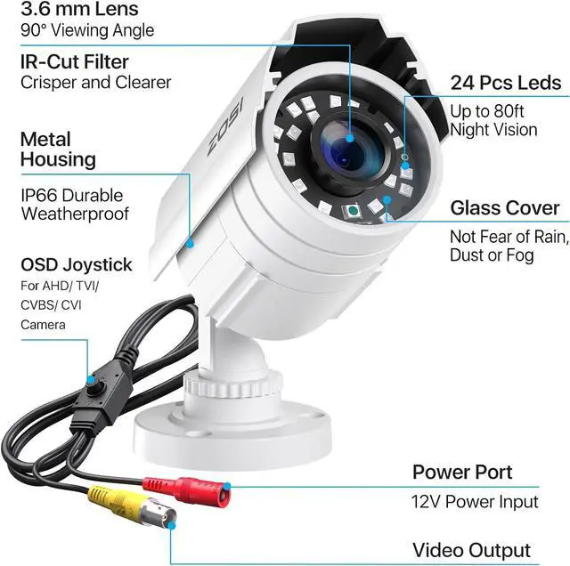 (3). [ IP66 Metal Weatherproof ] __ Built with high-quality aluminum materials, this camera is designed to withstand harsh weather conditions, featuring an IP66-rated metal casing for reliable performance in rain or snow. The 3-axis camera stand and cable-through bracket provide a secure and hassle-free installation. (Please note: Camera power supply and coaxial video cables are required but not included; they are sold separately.)