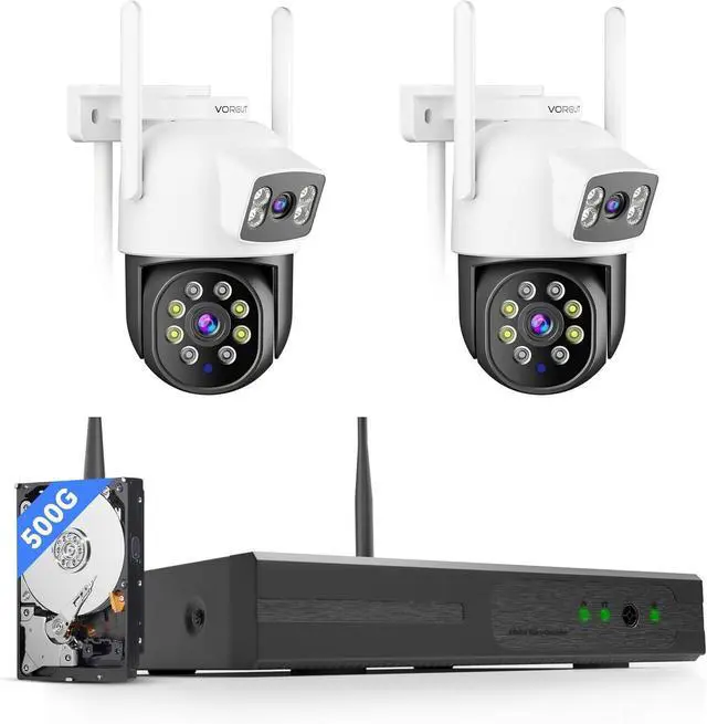Gadpiparty Wireless Security Camera System Outdoor, 2pcs 2K Dual Lens PTZ Auto Tracking Cameras for Home Security, 2.4G/5G WiFi, Color Night Vision, Human Detection, 16CH NVR with 500GB HDD