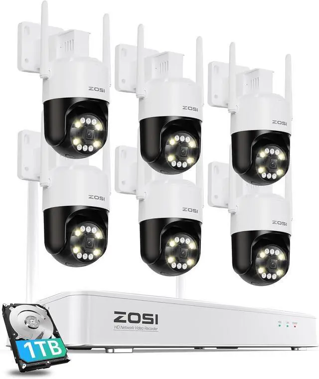 ZOSI 3K 5MP Wi-Fi 6 Security Camera System Wireless,6pcs WiFi Pan Tilt Cameras,Person Vehicle Detection,Motion Track,Color Night Vision,2 Way Audio,8CH 4K NVR with 2TB HDD for 24/7 Recording,Plug-in