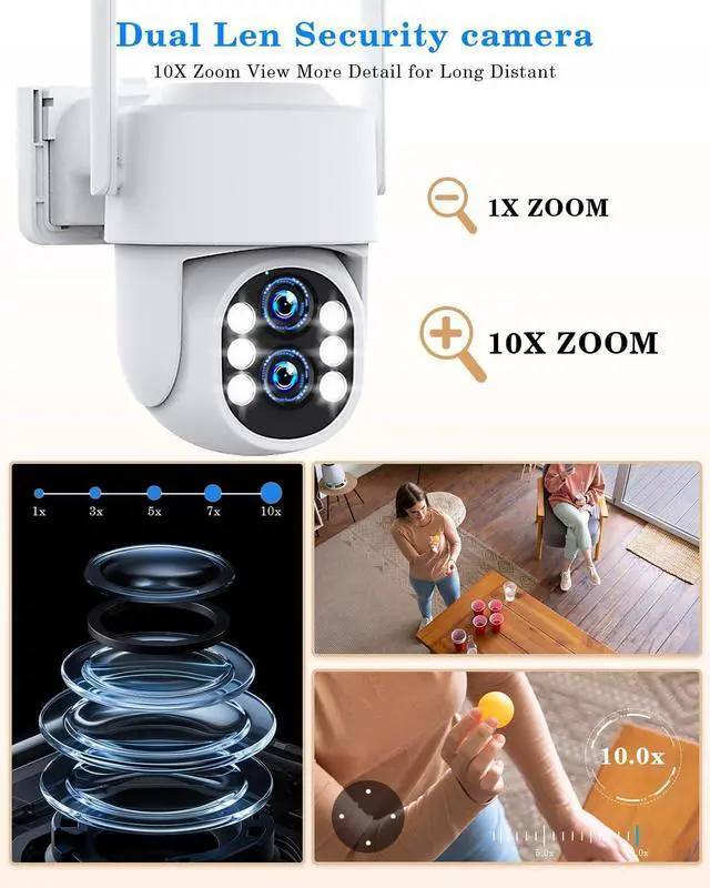 Dual Lens, 10X Hybrid ZoomOutdoor wireless camera's wide-angle lens and telephoto lens can bring you a wide field of view and clear close-ups at the same time. You will see more detailed content in the camera image, and small objects will become larger and clearer in your field of view.