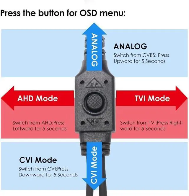 Default / UP for 5 seconds: CVBS 960HDown for 5 seconds: CVILeft for 5 seconds: AHDRight for 5 seconds: TVIImage Sensor: 1/2.7CMOS CMOS with IR-Cut.Active Pixels: 1280(H)×720(V).Resolution: 720P (It Default 960H mode).Singal mode: TVI/AHD/CVI/CVBS 960H.Lens: 3.6mm , IR LEDs Amount: 24pcs, 5mm LEDs.IR Distance: up to 65ft (20m).Weather-resistant It could be widely installed in home, store, office, school and any place.Protect your family, parents , baby ,property and everything.