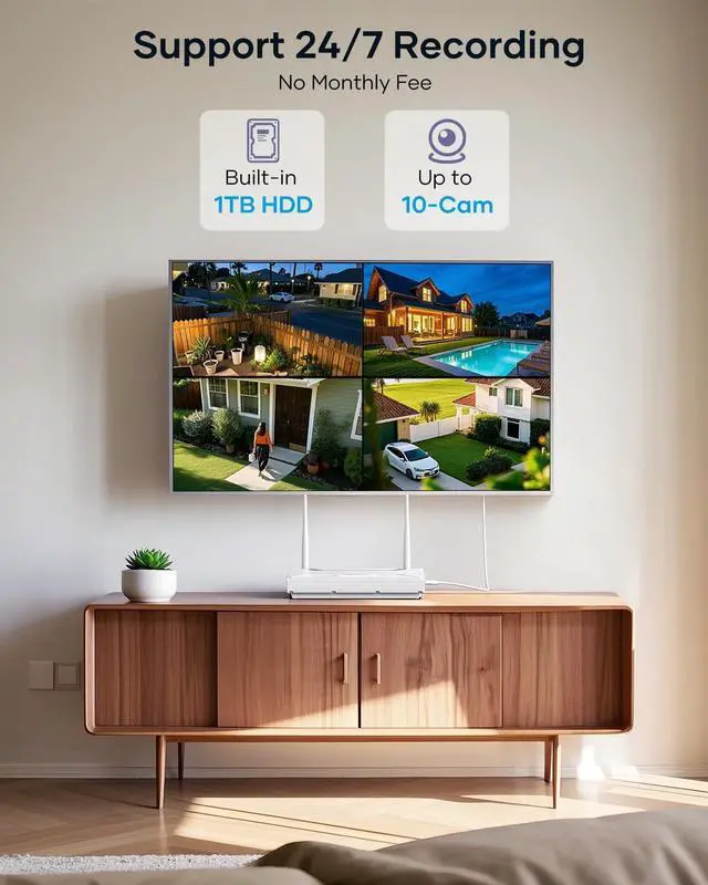 10CH Expandable NVR: This wireless security camera system is equipped with 1 NVR (Network Video Recorder), which supports simultaneous access of up to 10 cameras. Even if you expand more cameras in the future, the NVR can still provide stable management and video storage (1TB HDD included), which is convenient for you to manage the whole surveillance system easily. In addition, you can easily connect the NVR to a larger screen or smart TV/PCMinimum 1080P pixels via an HDMI port