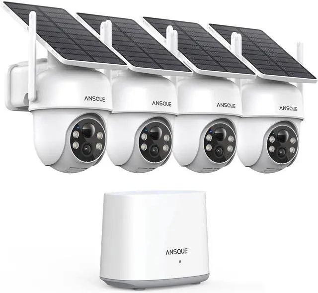 4× Wireless Camera with SoIar PaneI 1× Homebase 1× Ethernet Cable 1× Power Adapter for HomeBase 4× Type-C Charging CabIe 4.6 out of 5 starsANSQUE Security Cameras Wireless Outdoor Home System, 4 Camera Kit, No Subscription Fees, Solar Powered, Local Storage, 365-Day Battery Life, 360°PTZ Surveillance, Auto Tracking, 2K Color Night Vision