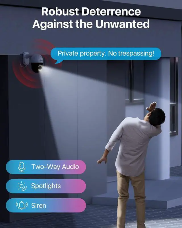 (1). [ AI Get Smarter Alerts that Matter ] __ Enjoy smarter AI detection capabilities, including face, people, vehicle, sound, pet, and package detection, which reduces false alarms effectively. You can also customize the specific areas where your camera detects motion to receive notifications that matter most to you. Additionally, the camera automatically activates a sound and light alarm when motion is detected, and sends prompt email and push notifications directly to your mobile device.