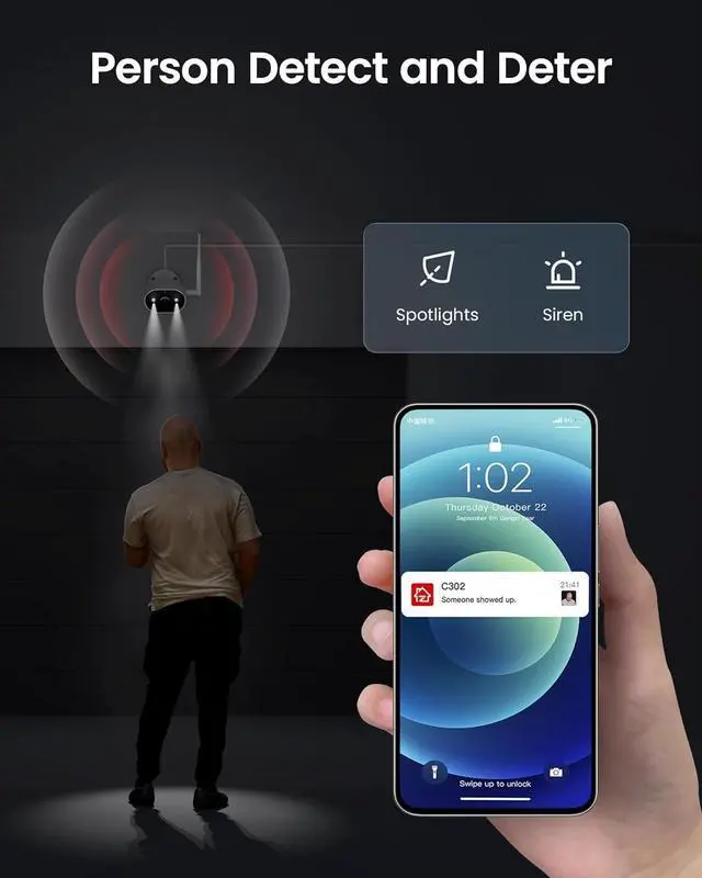 Smart Human Detection & Spotlight Siren--Advanced AI analytics accurately distinguishes people(reduces false alerts).Automated defense system: Triggers bright spotlight siren when human motion detected.Instant mobile alerts.Manual remote activation via app to scare off suspicious activity