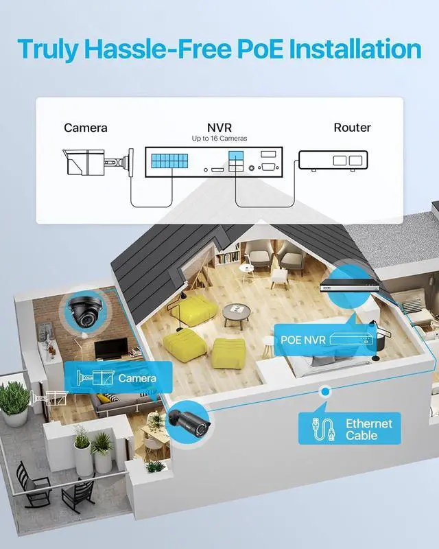 (5). [ Simple Plug & Play PoE Setup ] __ A single network cabling provides both video and power to your cameras, eliminating the need to install them near a power outlet. This wired connection offers a more stable and reliable solution compared to wireless security systems.