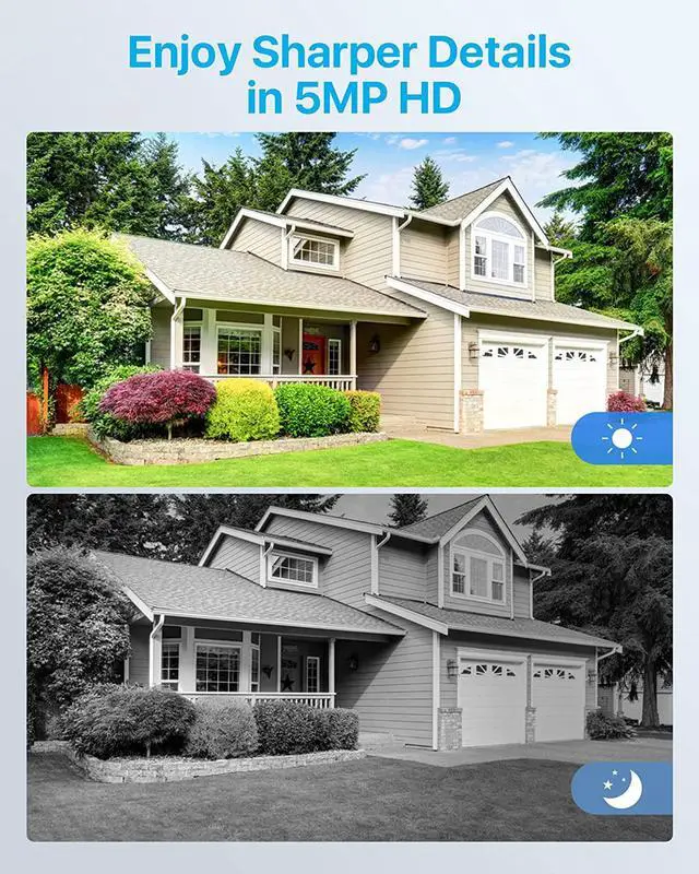 5MP Full HD Video-- 5 Megapixel Super High Definition Video, 2.5 x better than 1080P Full HD, super high definition video to see every detail and protect your premises. Get a sharp and crisp image day or night with the camera's automatic IR-cut filter. Up to 120ft night vision. IP67 Metal durable weatherproof housing, cameras can be used indoors and outdoors.