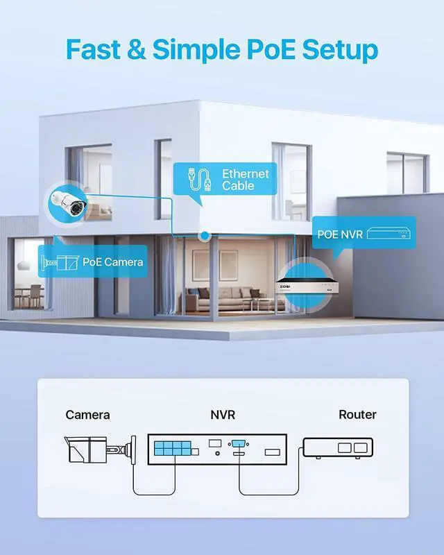 Simplify PoE installation-- power over Ethernet means the IP cameras connect to the NVR with a single cable that transmits both data and power, no need to connect power cable, lower risk of electric leakage and easy to set up. This literally simplified the installation and reduced costs.