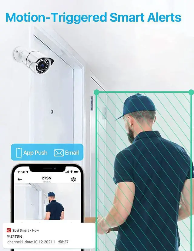 Customizable motion detection zone and alerts -- Smart notifications with image will be pushed to your smartphone via ZOSI Smart app when the camera detected human motion. You also can setup the detection zone from your NVR to minimize false alarms.