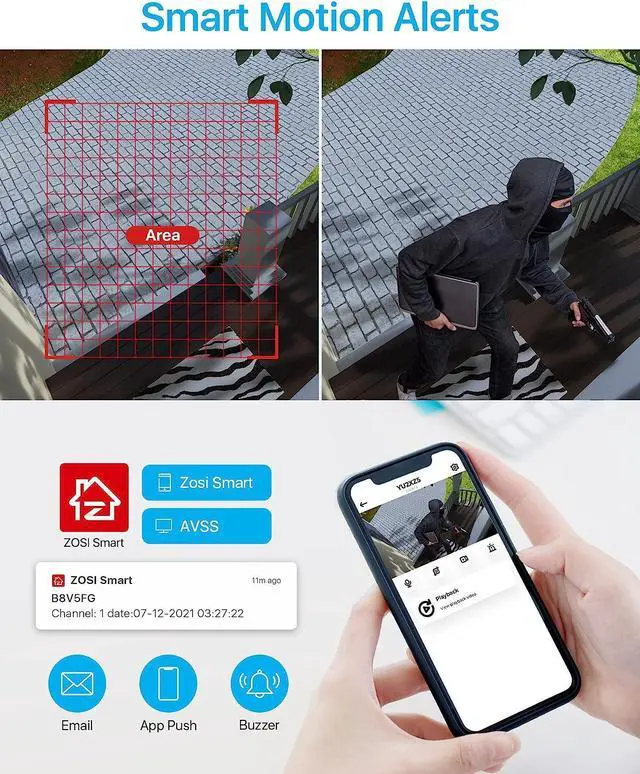 You will be alerted by emails, App push notifications and buzzer alarms in the DVR when motions are detected.