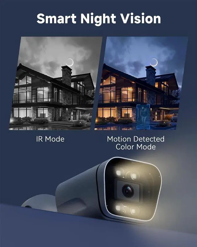 Color Night Vision: Our outdoor security cameras use infrared night vision by default and switch to full-color night vision with a white light when a person is detected, Up tp 30M distance.