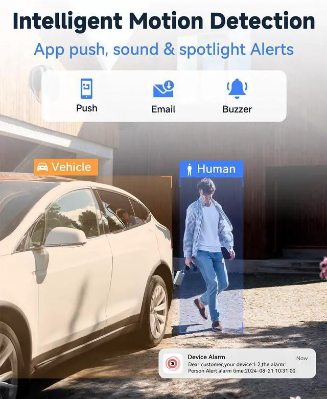 Smart AI Detection: Equipped with advanced AI, this home security system can distinguish between people and vehicles.