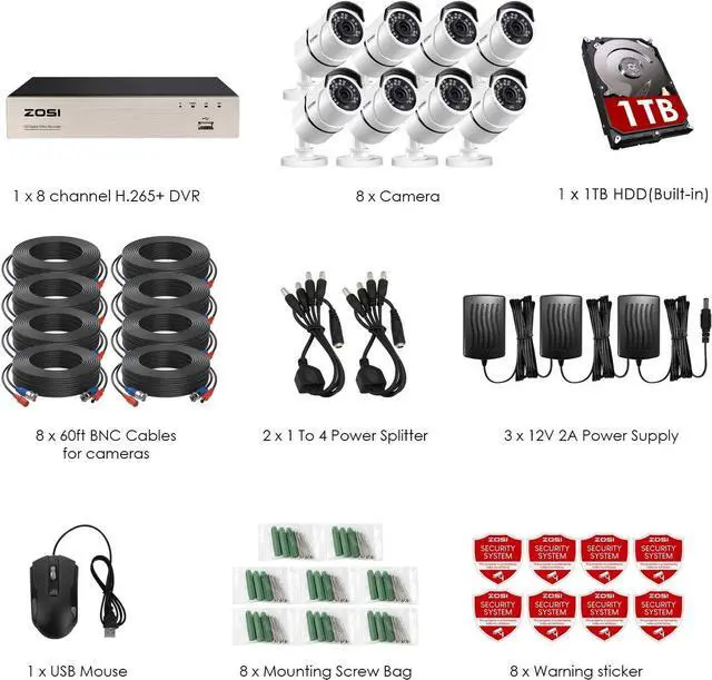 1x H.265+ 8CH DVR with 1TB HDD pre-installed8 x 1080P Bullet Cameras8 x 60FT CCTV cables2 x 1 to 4 power splitter cables3 x 12V/2A power supply8 x Mounting Screw Bags1 x USB Mouse1 x User Manual The 1080P HD cameras built in 36pcs IR LED lights. 120ft Night Vision Automatically Activates When Low Light is Detected, which allow you to see stunning clarity details even at night. Each camera with a 3.6mm megapixel lens and wide 90 Degree viewing angle.