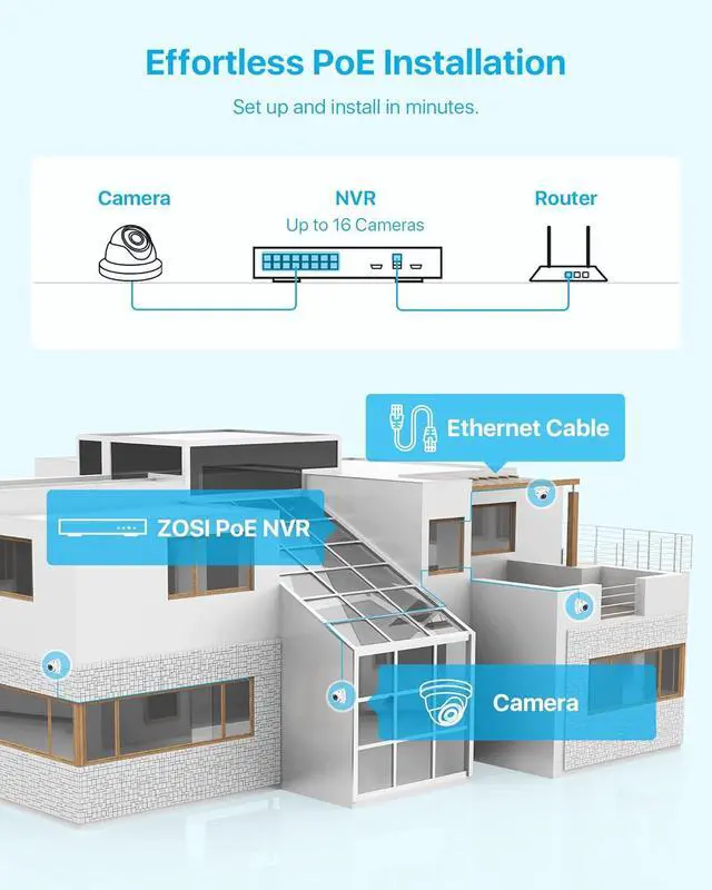 Stable Plug and Play PoE SystemSimple PoE connection makes it easier to set up and install your home security camera system. Unlike the CCTV DVR systems, videos from the IP camera system will not be degraded or destroyed by cables. The digital signal will keep a real high-definition image via ethernet cables.