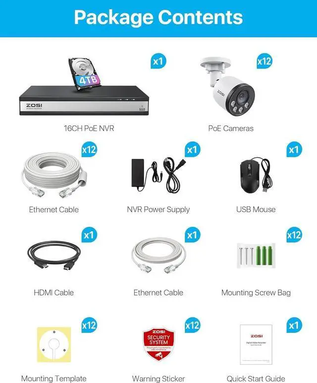 4K 16Channel PoE NVR SystemWith the advanced H. 265 technology, which could double the data compression ratio, keep the high quality video even with low bit-rate. This is a 16Channel 4K NVR Recorder, you can add more ZOSI 4K,5MP,4MP and 3MP PoE cameras.(Only Support ZOSI PoE Camera). And the PoE camera is connected to the NVR through a cable that transmits data and power, which is simple to install and low in cost.