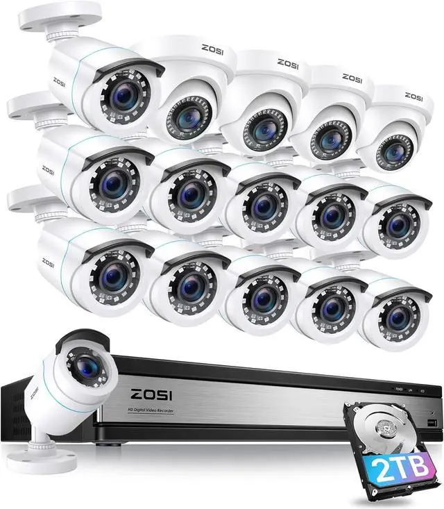 (2). [ 2MP Extendable System Overview ] __ Exclusive H.265+ 16-channel 1080N DVR recorder paired with 16 weatherproof 1080p bullet dome cameras, offering 80ft night vision and a 90° viewing angle. The 60ft BNC+DC CCTV cabling delivers both video and power, providing a more stable and reliable connection than wireless systems. (Includes 2TB security-grade hard drive).