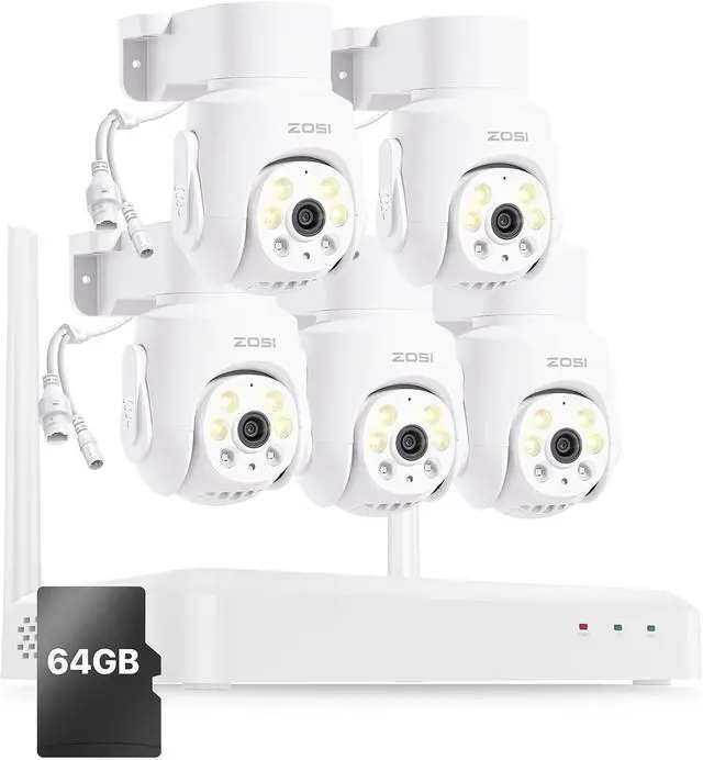 Gadpiparty ZOSI 8 Channel 3K Wi-Fi 6 Security Camera System with 64G SD Memory Card for 24/7 Record, 5 x 5MP Pan Tilt WiFi Camera with Auto Tracking, Color Night Vision, Plug-in, AI Person Detect, 2-
