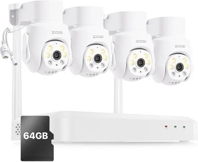 Gadpiparty ZOSI 8 Channel 3K Wi-Fi 6 Security Camera System with 64G SD Memory Card for 24/7 Record, 4 x 5MP Pan Tilt WiFi Camera with Auto Tracking, Color Night Vision, Plug-in, AI Person Detect, 2-