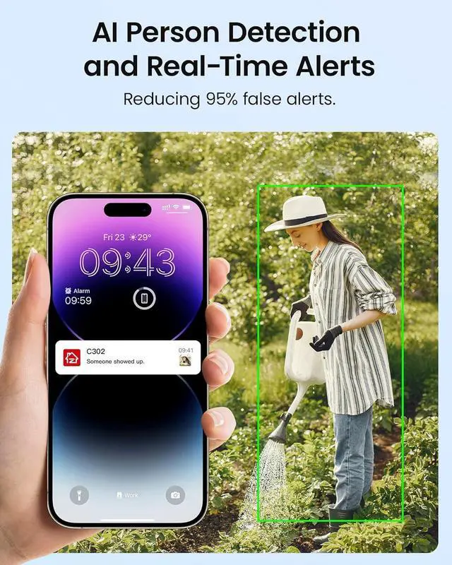 Smart AI Human Detection--Advanced AI-powered analytics accurately identifies people while filtering out pets, vehicles, and other false triggers. Get only relevant alerts and minimize unnecessary notifications for smarter security.Customizable detection zones ensure you only monitor important areas.