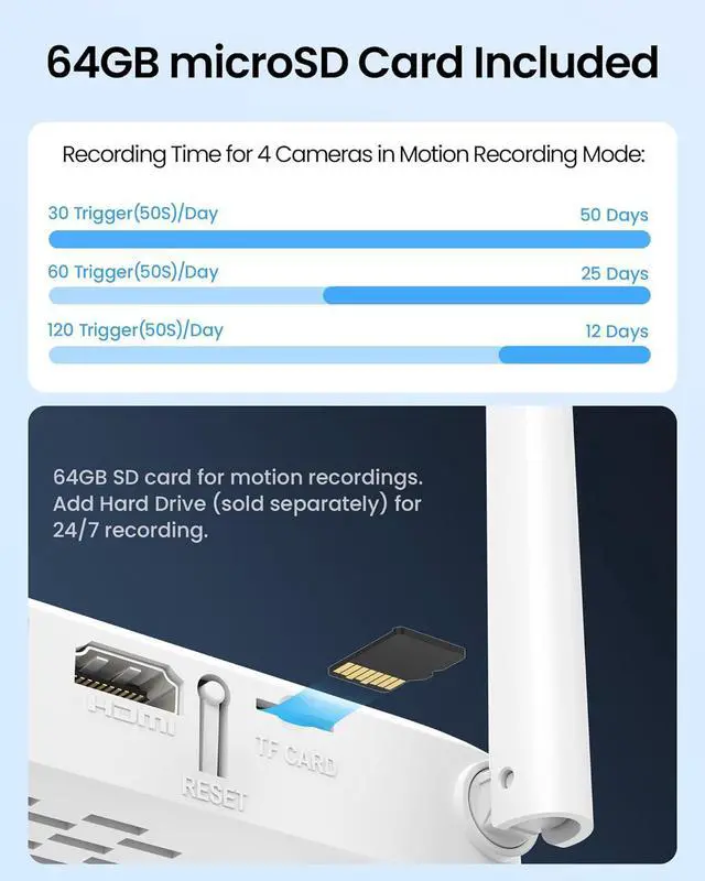 Flexible Storage & No SubscriptionIncludes 64GB SD card (up to 25-day motion recording for 4 cameras). Supports Hard Drive expansion (sold separately) for 24/7 recording. H.265+ compression saves 50% storage vs. H.264. All data is encrypted locallyno hidden fees or cloud subscriptions.