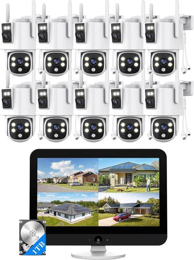10 Channel WiFi 6 Monitor & 24/7 Recording - The 10 channel surveillance camera system supports 2.4G/5G WiFi, dual signals to enhance the monitoring range and video smoothness. The cameras are plugged in to ensure constant monitoring, all year round, watch playback anywhere you want.The monitor comes preloaded with an extra-large 1TB capacity (supports up to 6TB) for longer-lasting recording and peace of mind for playback