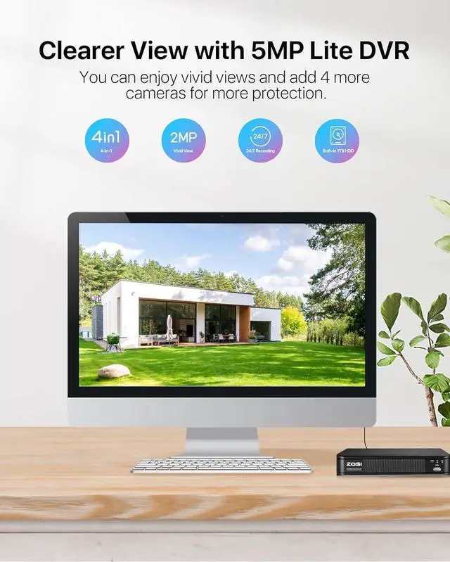 (4). [ Advanced H.265+ High Efficiency Video Compression ] __ ZOSI self-developed H.265+ video coding technology extract features that focus on characteristics of the surveillance scenes for larger storage space and better image quality. H.265+ can further improve compression ratio on the basis of H.265 standard and save about 80% storage compared with H.264, and thus effectively saving storage resources and provides an excellent and smooth viewing experience.