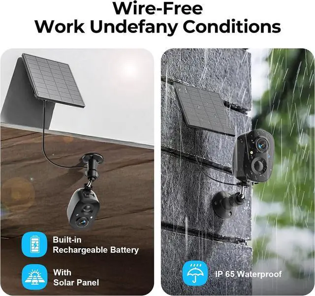 100% Wire-Free | Weatherproof | Extended Battery Life - The IP65 waterproof IP camera built-in rechargable battery comes with a high-efficiency solar panel, designed to provide a consistent supplemental power source under adequate sunlight. The solar surveillance camera ensures that just 2 hours of direct sunlight per day provides enough power for the home security camera to operate all day, designed for long-term outdoor installation. A practical choice for homes, garages, sheds, or fences(Note: Only connects to 2.4GHz Wi-Fi)