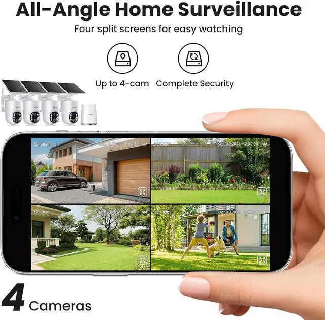 SOLIOM- 5MP Security Cameras Wireless Outdoor, No Subscription & Solar Powered,4-Cam Pack Cameras for Home Security with 360° Auto Motion Tracking, 3K Color Night Vision,5G & 2.4G Router Compatible