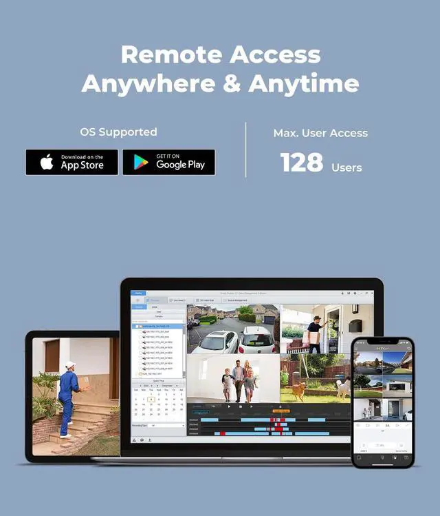 [Remote Viewing & Smart Motion Detection Alarm]: Download our free APP on your phone or install PC Client in your computer to have a remote view with Apple, Windows, and other Android devices. Every Camera owns a serial number which is secure.This NVR detects moving objects and triggers alerts when things happen. It will send an email immediately to your smart device, avoid any danger and protect home security.