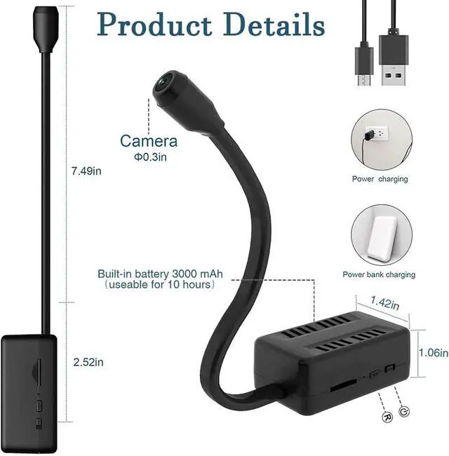 4 Record Modes and Battery Powered: All day record, alarm record, timing record, and mode. You can choose any one mode depending on your demand. This small security camera has a built in 3000mAh battery that can work for 10 hours on a full . If you want your micro camera to work long times, just plug it into an outlet or use a portable power bank, you can watch the room's security 24/7.
